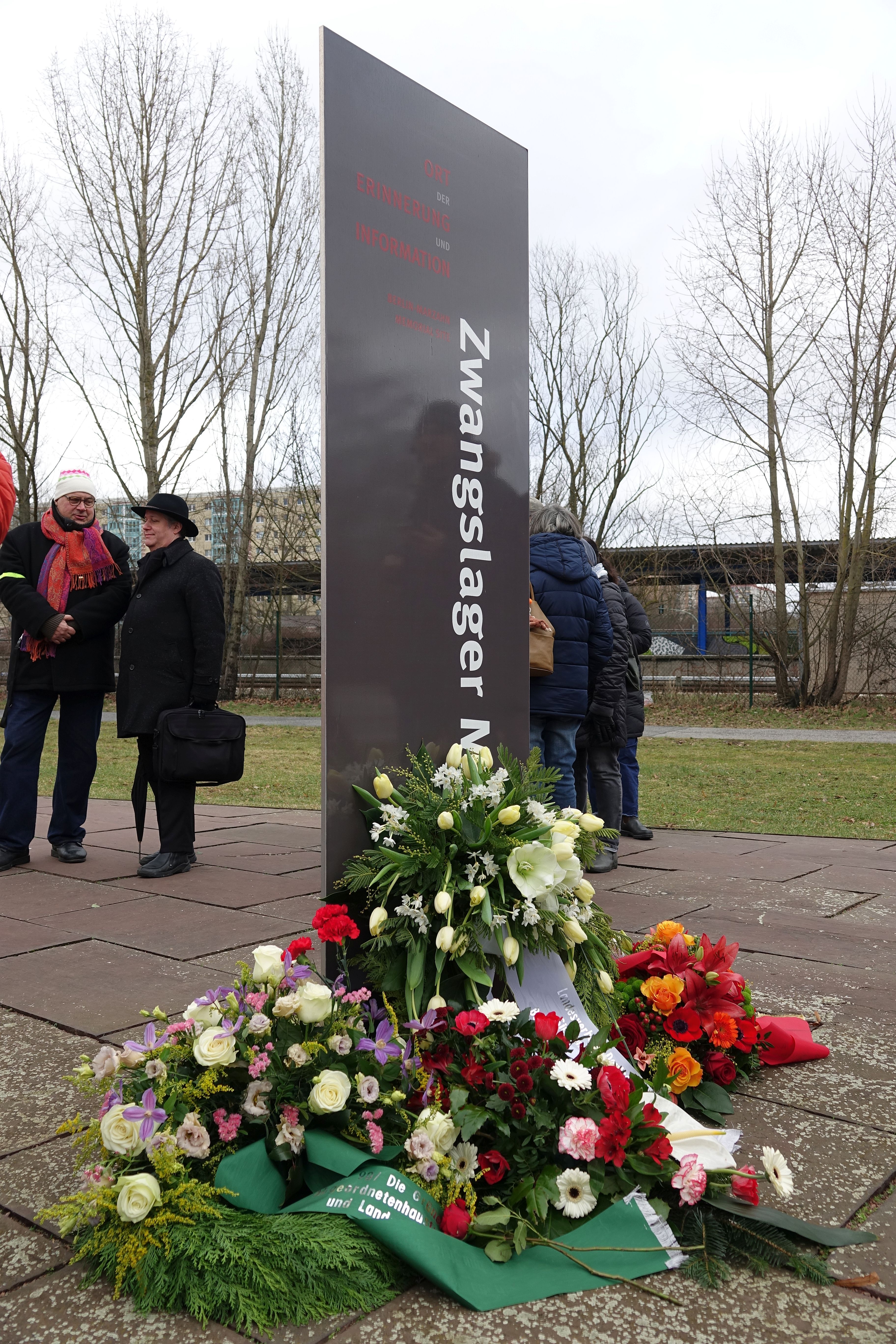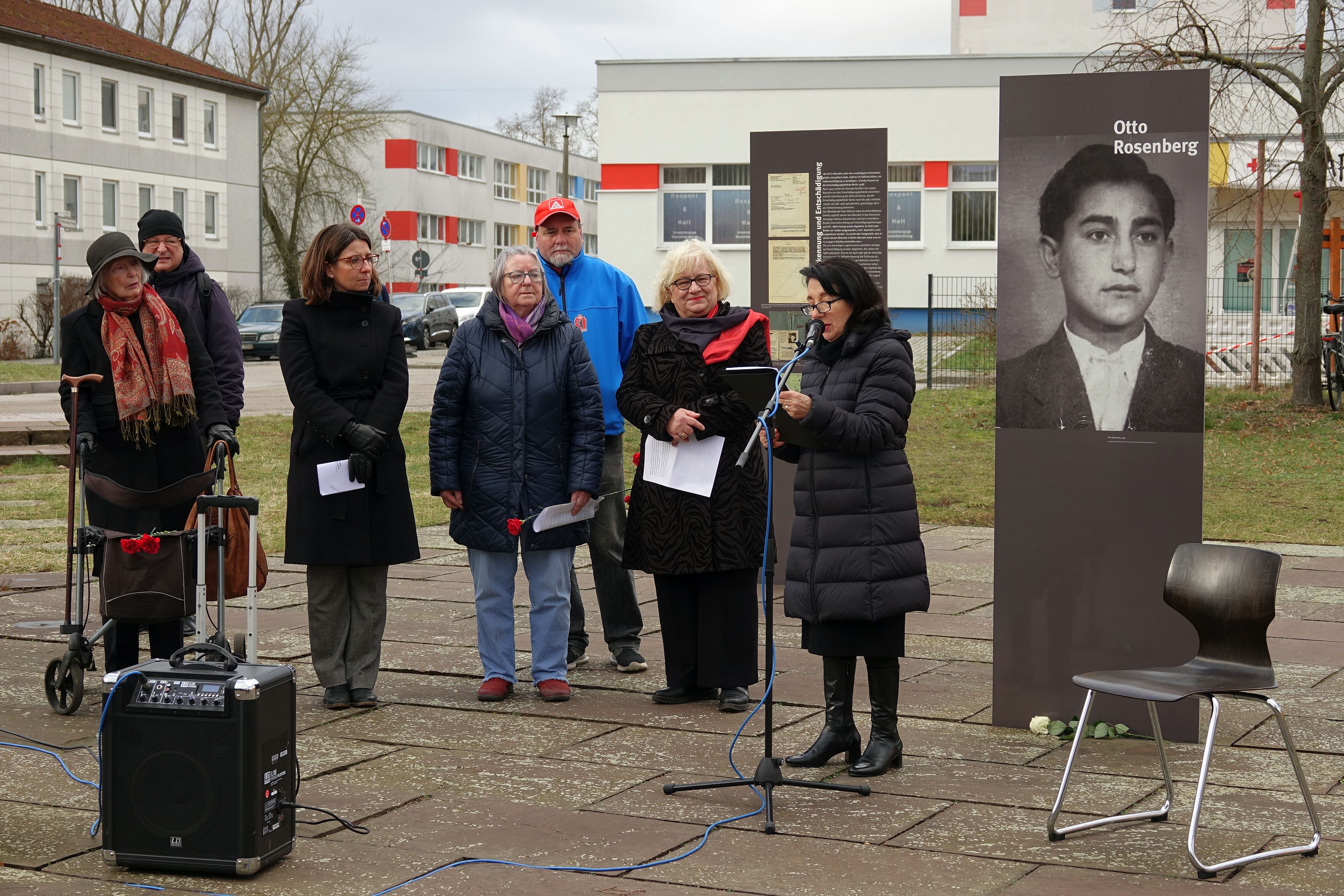 Anlässlich des Gedenktages für die Opfer des Nationalsozialismus 27. Januar 2024 veranstalteten die Gedenkstätte Zwangslager Berlin-Marzahn in Kooperation mit dem Landesverband Deutscher Sinti und Roma Berlin-Brandenburg und dem Bündnis für Demokratie und Toleranz Marzahn-Hellersdorf ein gemeinsames Gedenken auf dem Gelände des ehemaligen NS-Zwangslagers Berlin-Marzahn.