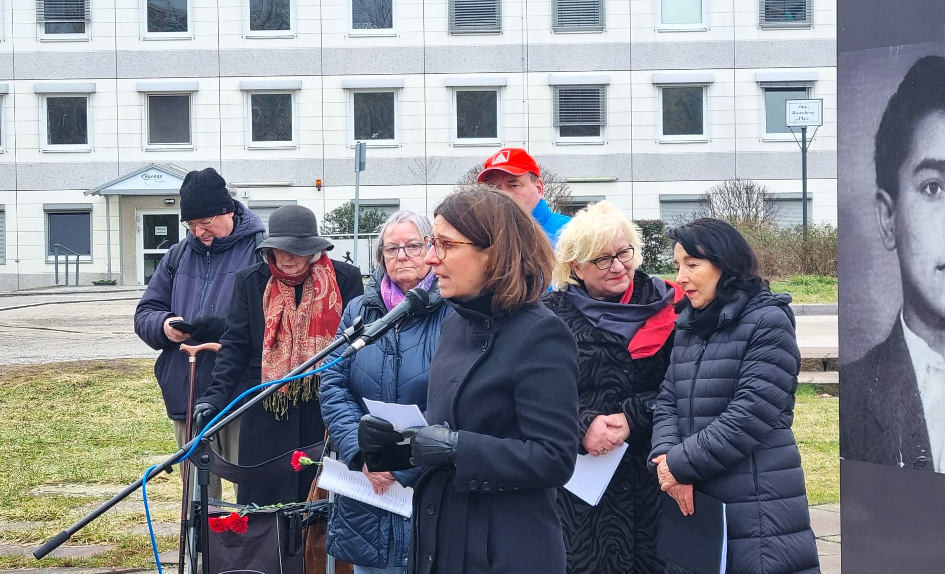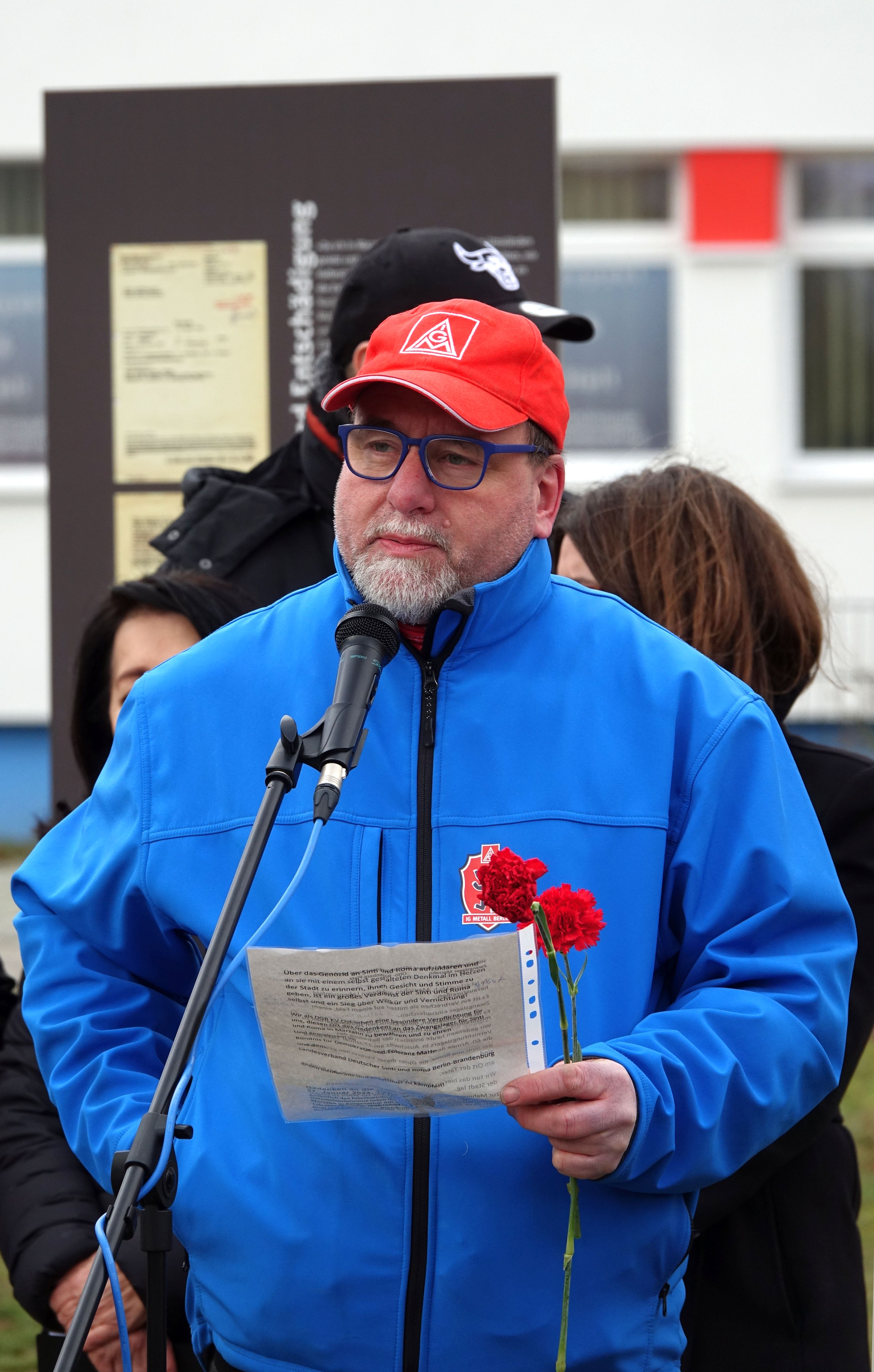 Es sprachen Petra Rosenberg, die Vorsitzende der Gedenkstätte Zwangslager Berlin-Marzahn und des Landesverbandes Deutscher Sinti und Roma Berlin-Brandenburg, Nadja Zivkovic, die Bezirksbürgermeisterin von Marzahn-Hellersdorf und Schirmfrau des Bündnisses für Demokratie und Toleranz Marzahn-Hellersdorf, Dr. Manuela Schmidt, Präsidentin des Humanistischen Verbands Berlin-Brandenburg, Dagmar Poetzsch, DGB-Kreisvorsitzende Ost und Rainer Heidenreich, ebenfalls von der DGB Berlin-Ost.